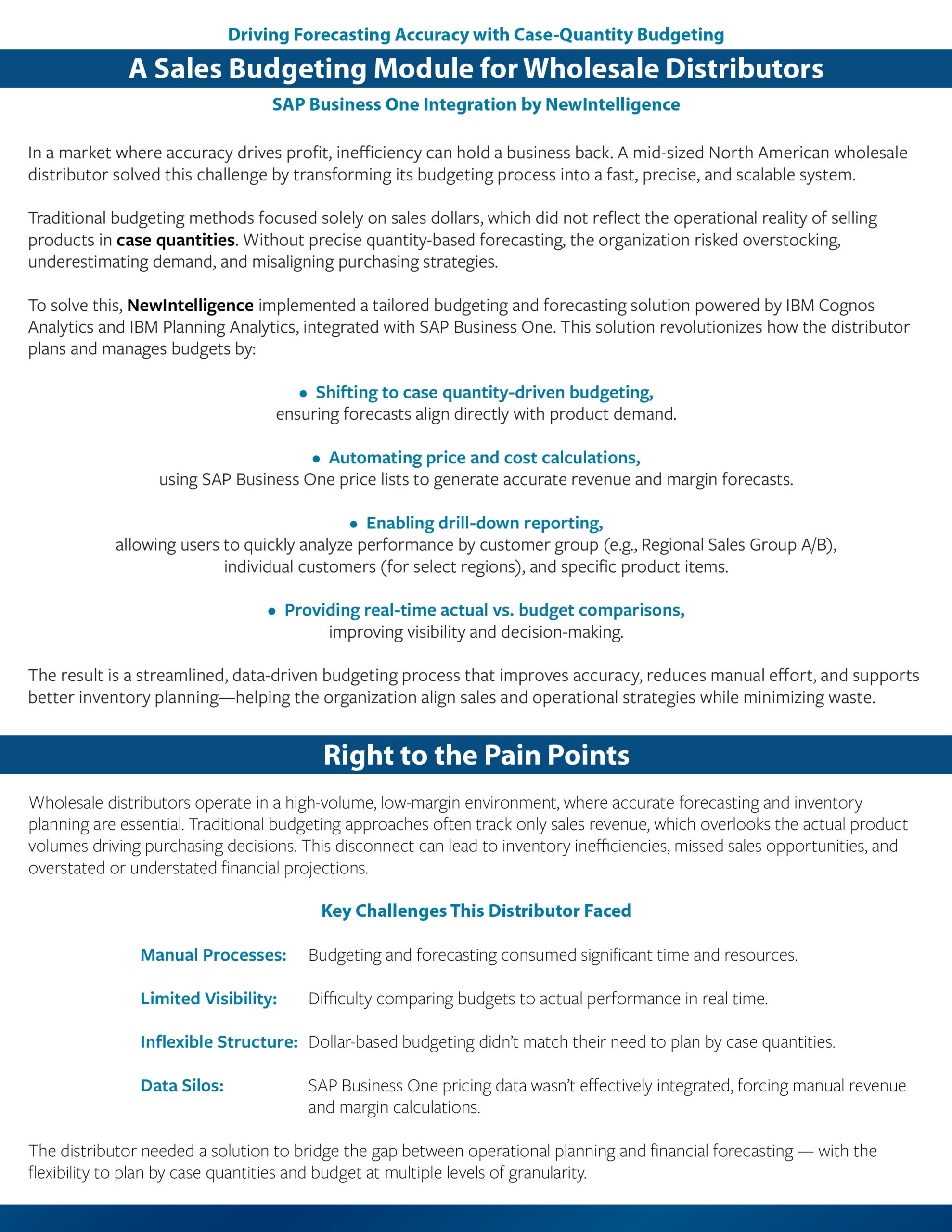 Wholesale distributors live on thin margins—so every forecast matters. If your budgets are still built on sales dollars alone, you’re planning with a blind spot. This whitepaper shows how shifting to case-quantity budgeting—integrated with SAP Business One and powered by IBM Cognos Analytics and IBM Planning Analytics—closes that gap and turns planning into a precise, repeatable, and scalable process.