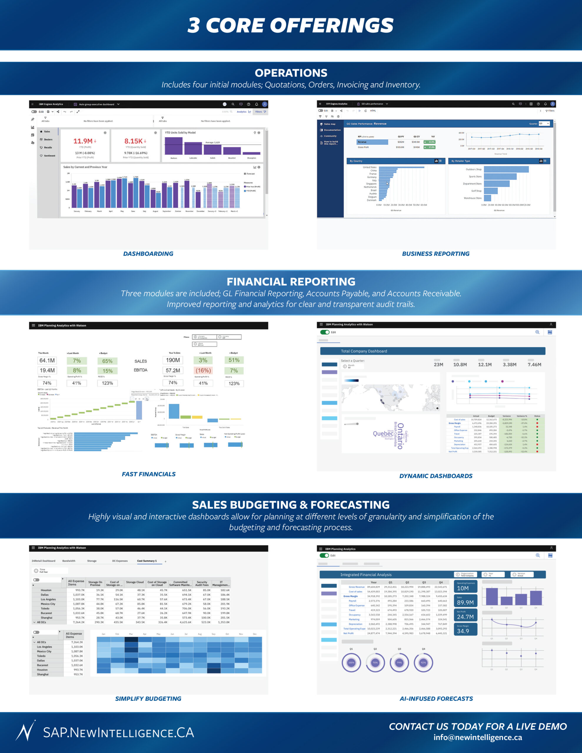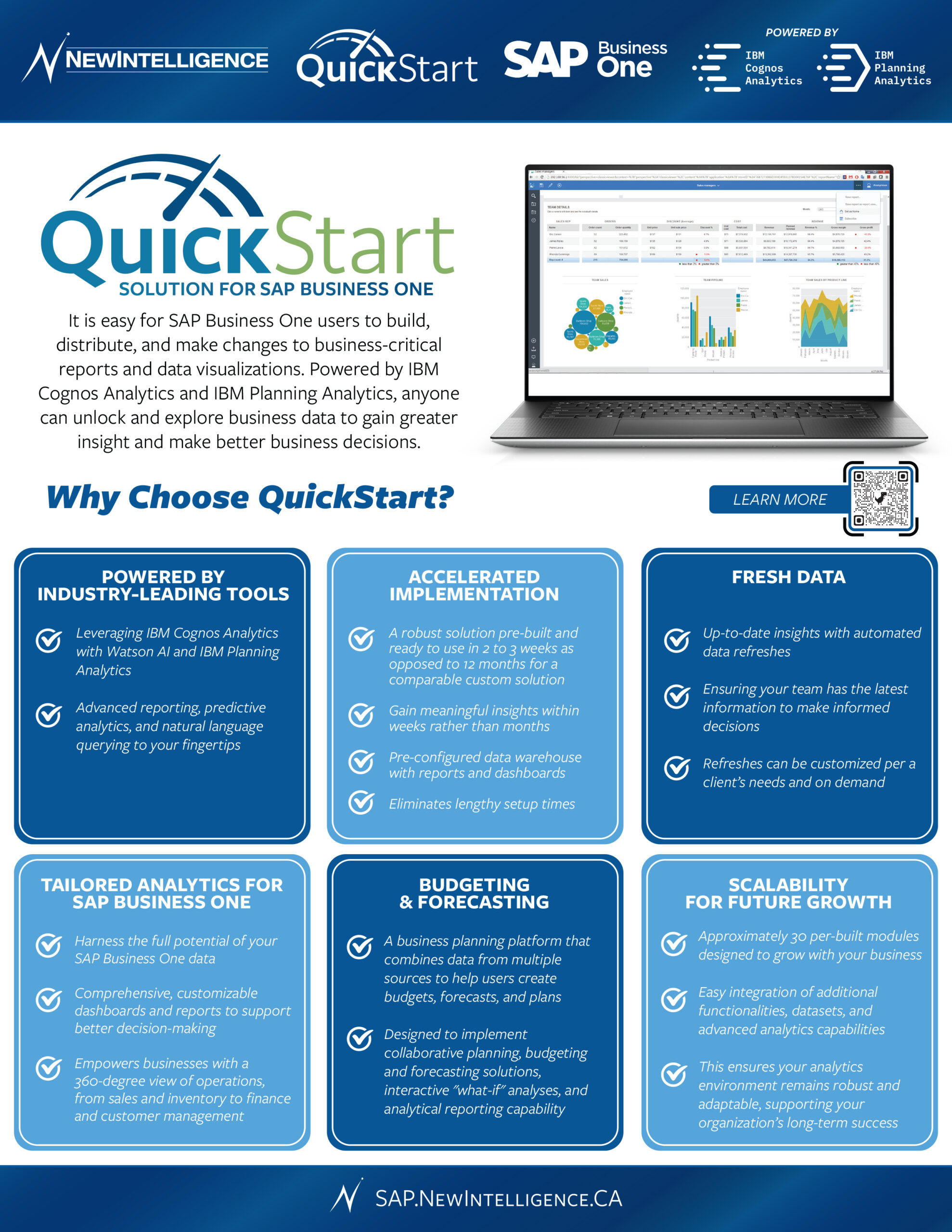 NewIntelligence’s QuickStart Solution delivers effortless reporting & analytics for SAP Business One users, providing an out-of-the-box powerful solution. Seamlessly integrating with SAP B1, it enables quick, data-driven decisions without heavy IT involvement, leveraging IBM Cognos Analytics 12.0.3 with Watson AI for enhanced insights and forecasting.
