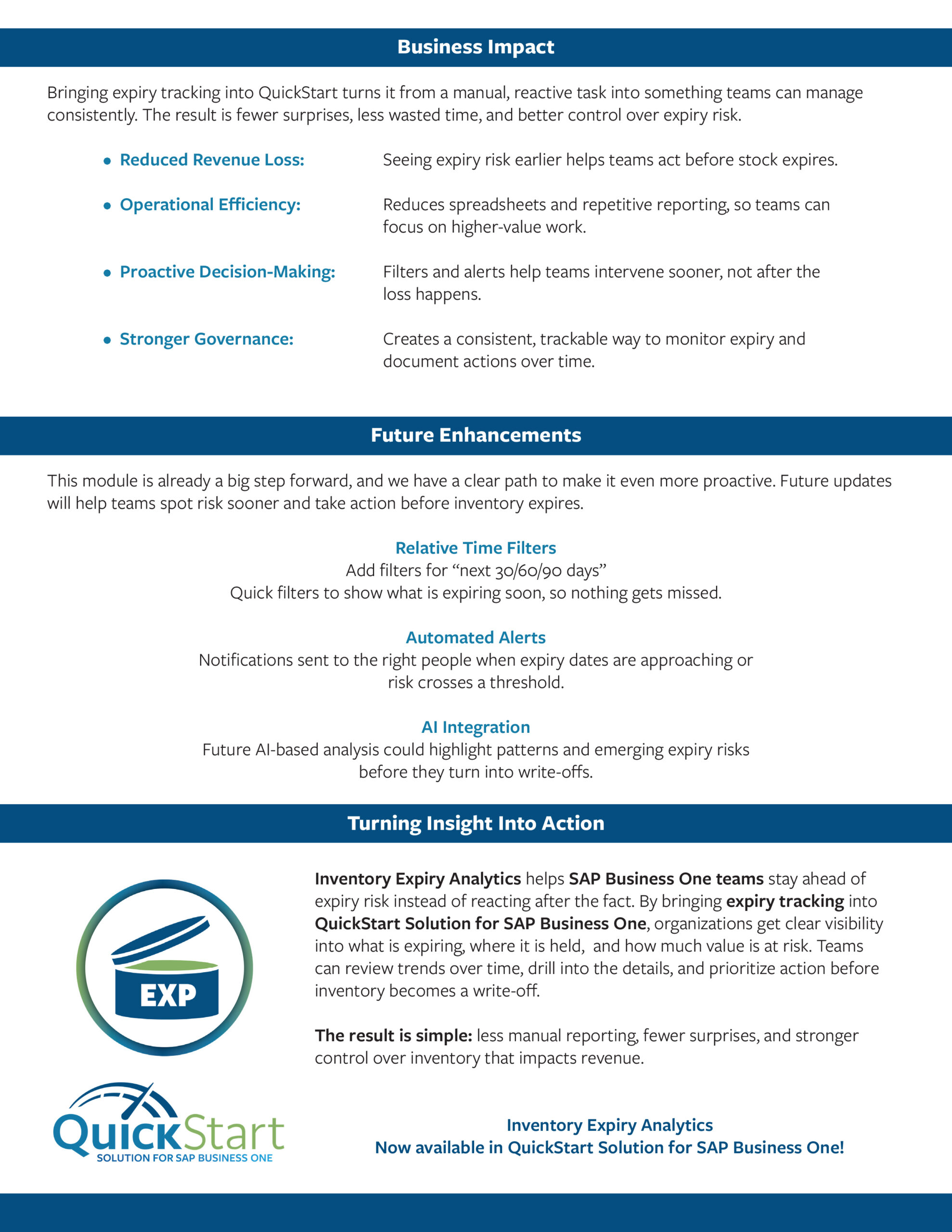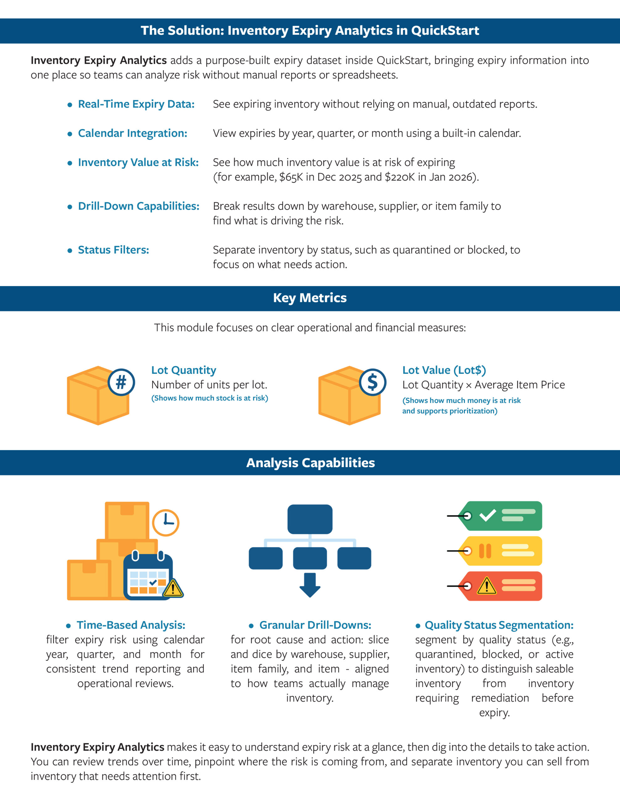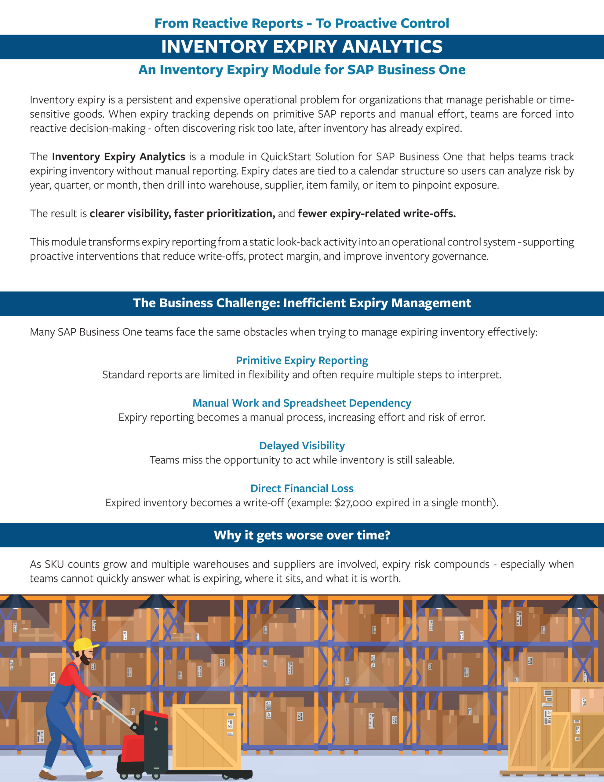 Inventory Expiry Analytics is a new module in QuickStart Solution for SAP Business One that helps teams stay ahead of expiring inventory with clear visibility into what is at risk, where it is held, and the dollar value tied to it. Keep reading below to see how the module works, what insights it delivers, and how it helps reduce expiry-related write offs.