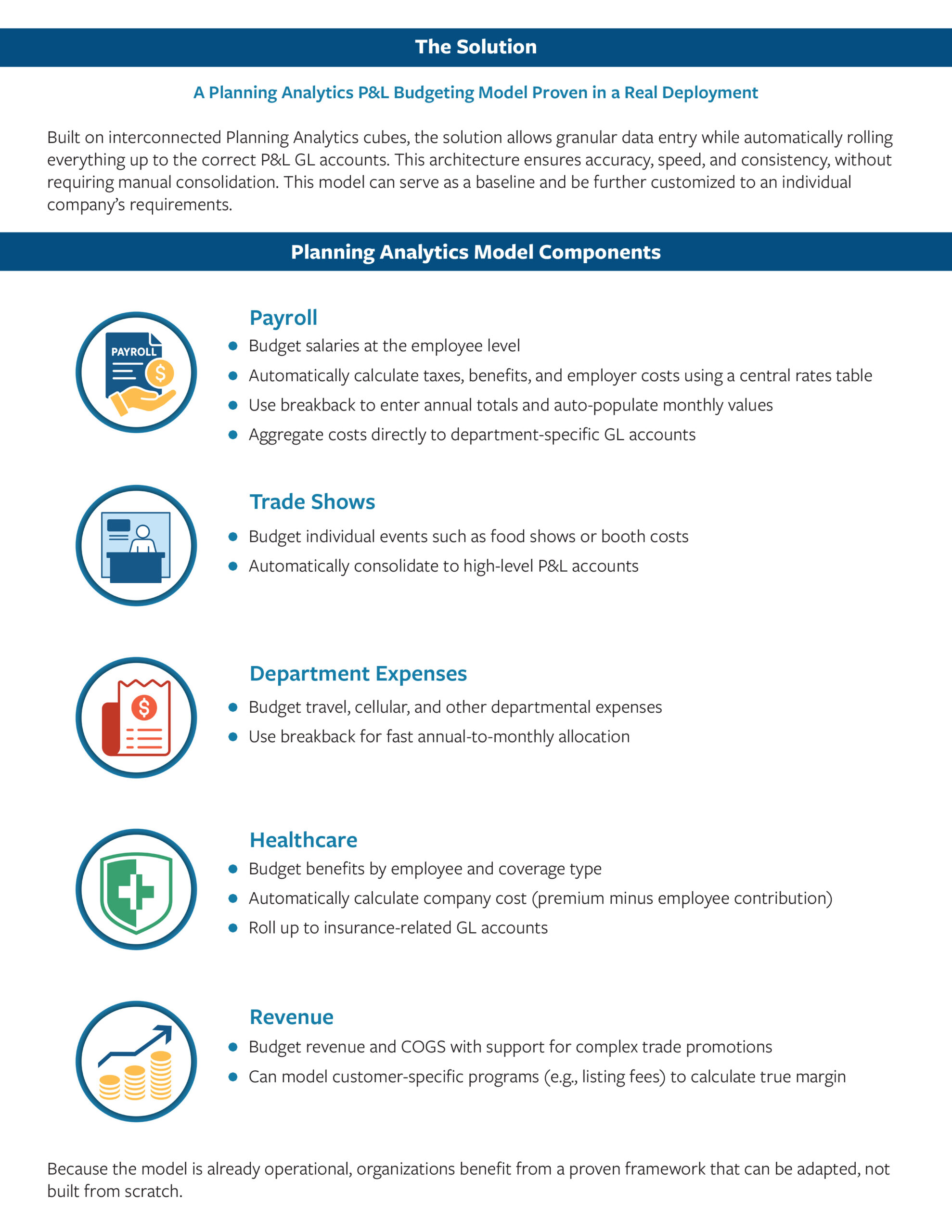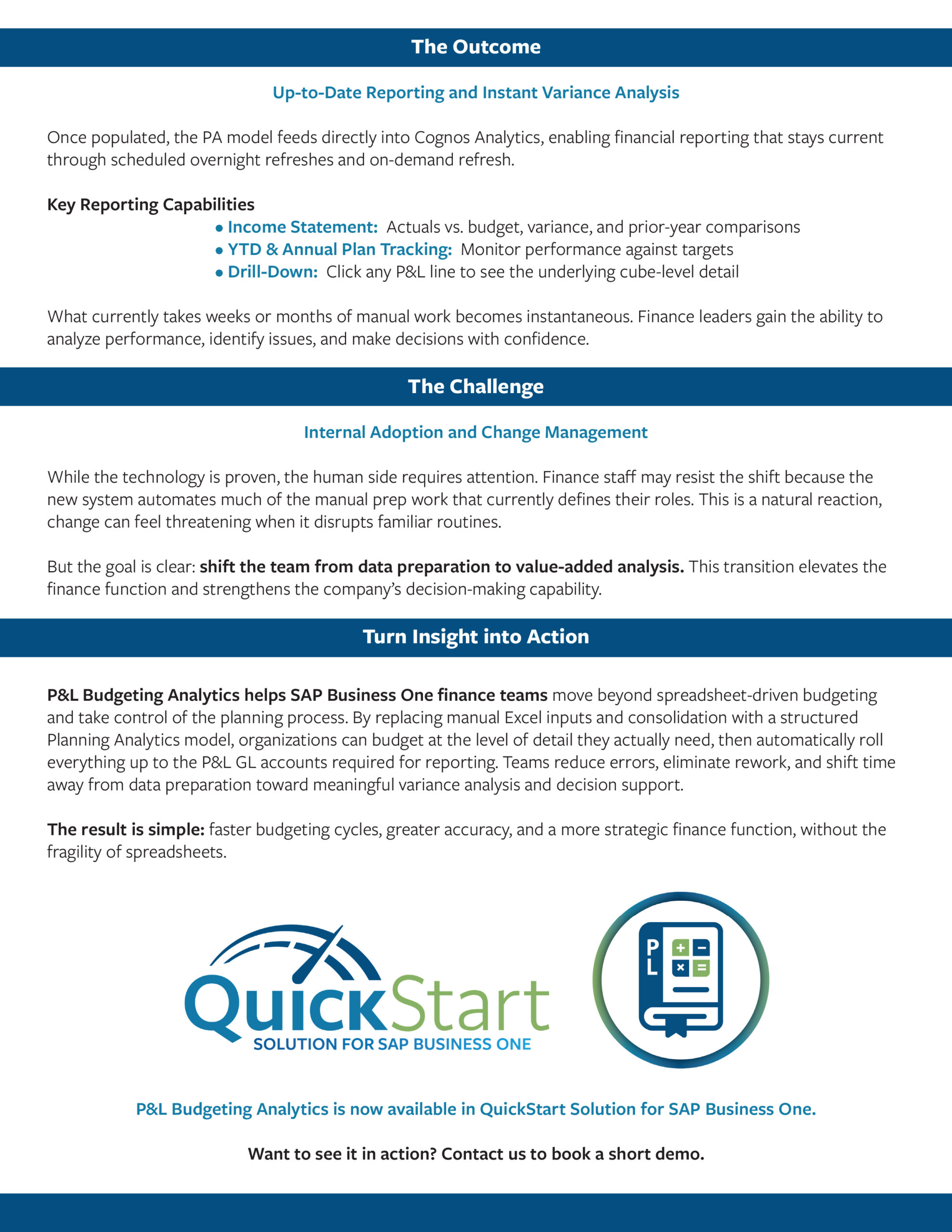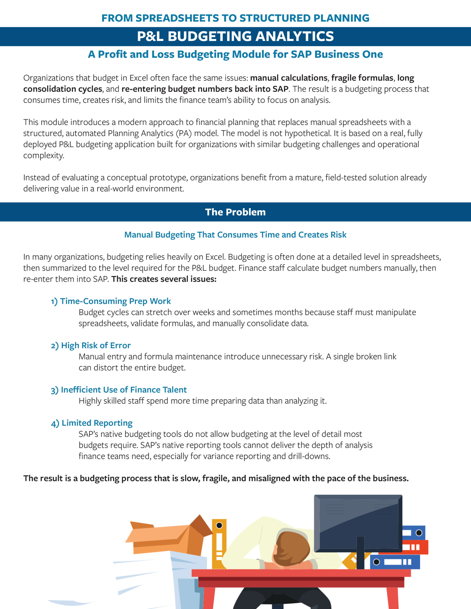 Profit & Loss Budgeting Analytics helps SAP Business One teams replace spreadsheet-driven budgeting with a structured Planning Analytics model that supports detailed budgeting and automatic rollups to the P&L. Read the white paper below to see how the module works, what it includes, and how it helps shorten budgeting cycles, reduce errors, and improve variance analysis.